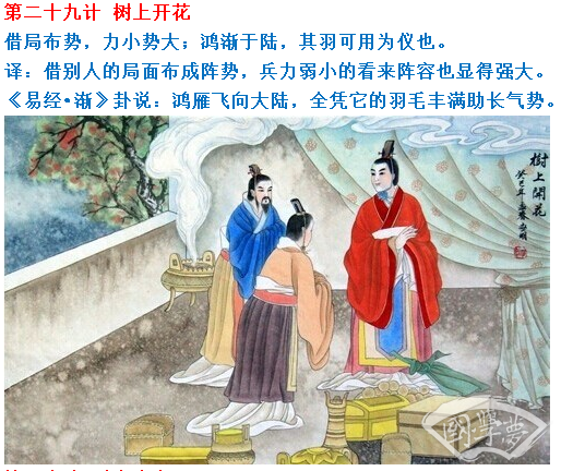 古人按语说:此树本无花,而树则可以有花,剪彩贴之,不细察者不易发,使 花与树交相辉映,而成玲珑全局也。此盖布精兵于友军之阵,完其势以威敌也。